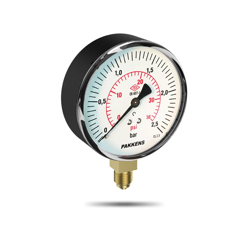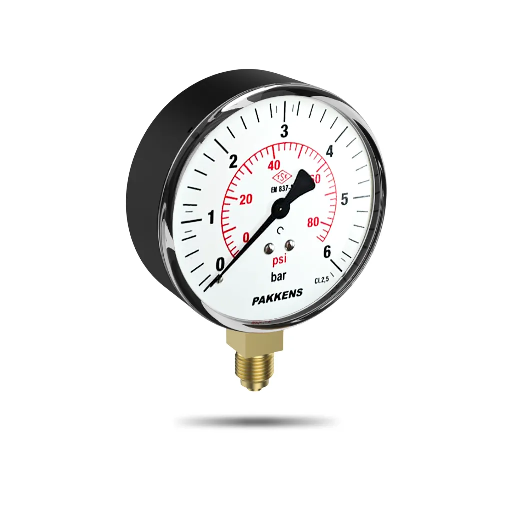 PAKKENS მანომეტრი Ø100 / 0-100bar / CL.2,5 , 1/2″, ქვედა მიერთებით